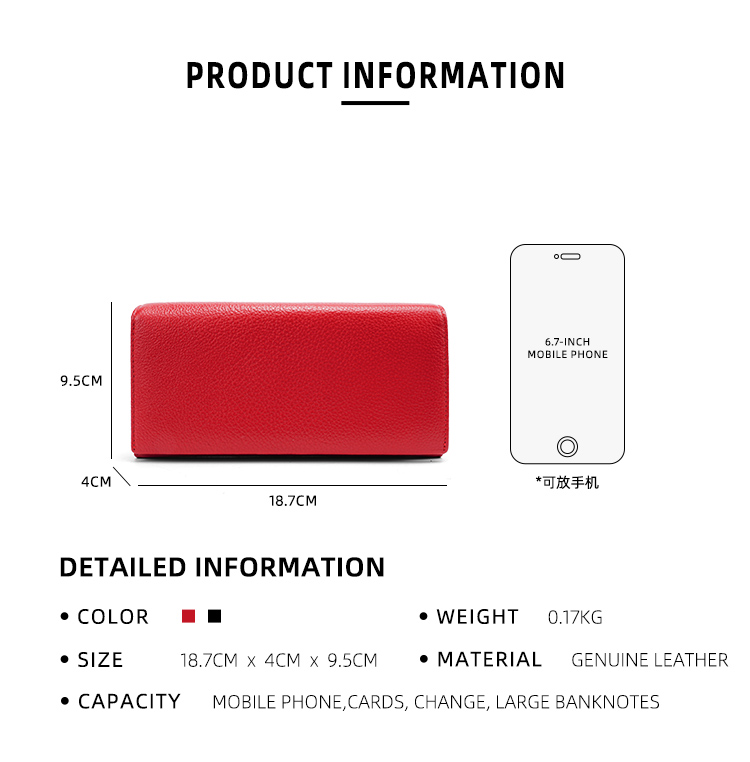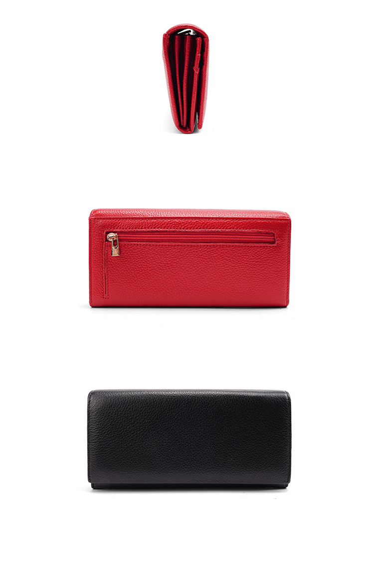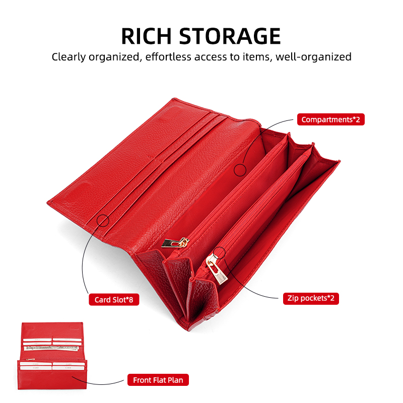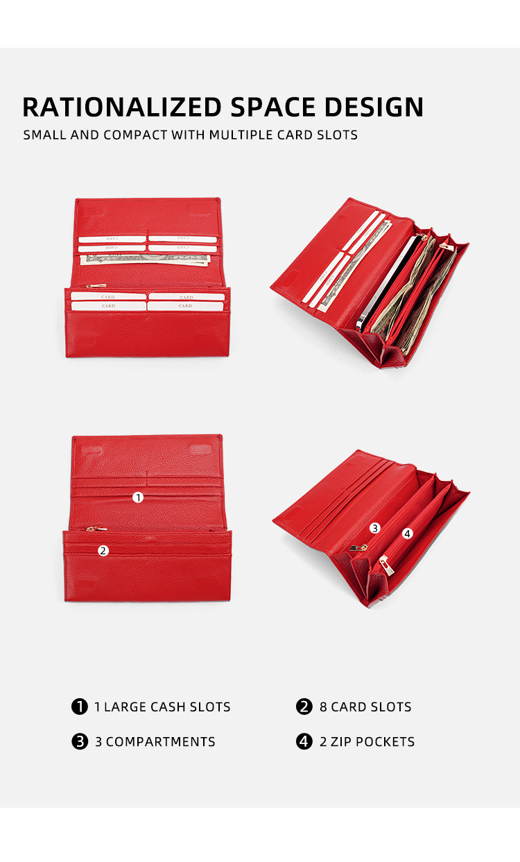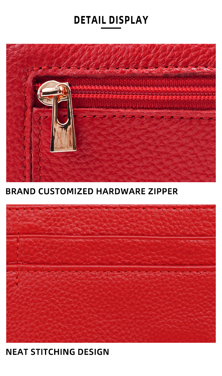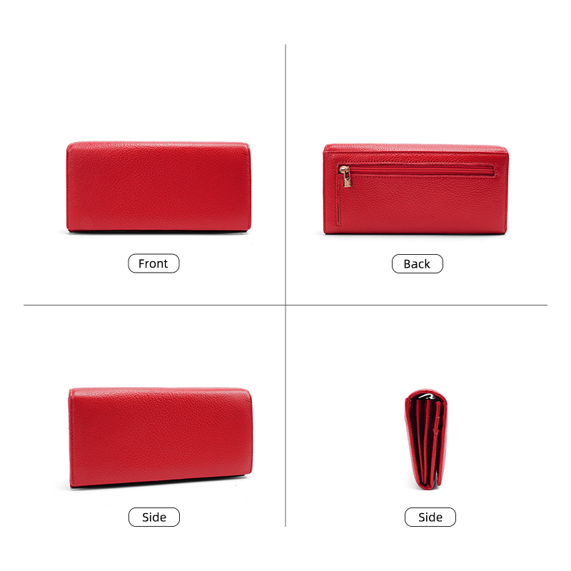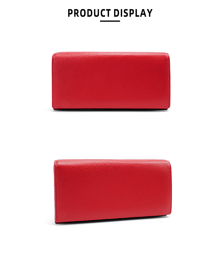 This vibrant red long wallet is crafted from premium pebbled genuine leather, offering a perfect blend of elegant design and rich storage for your daily essentials.