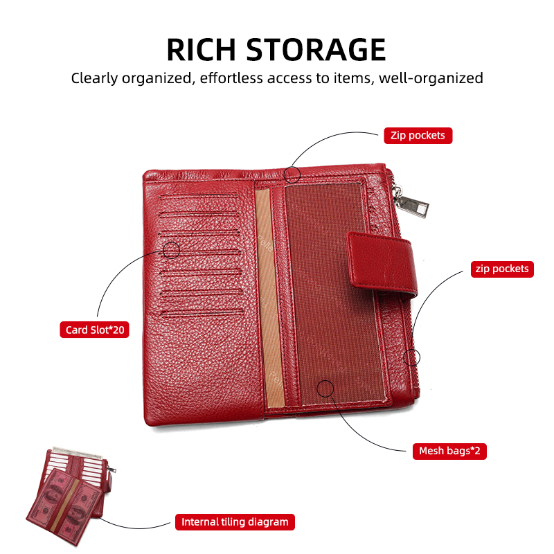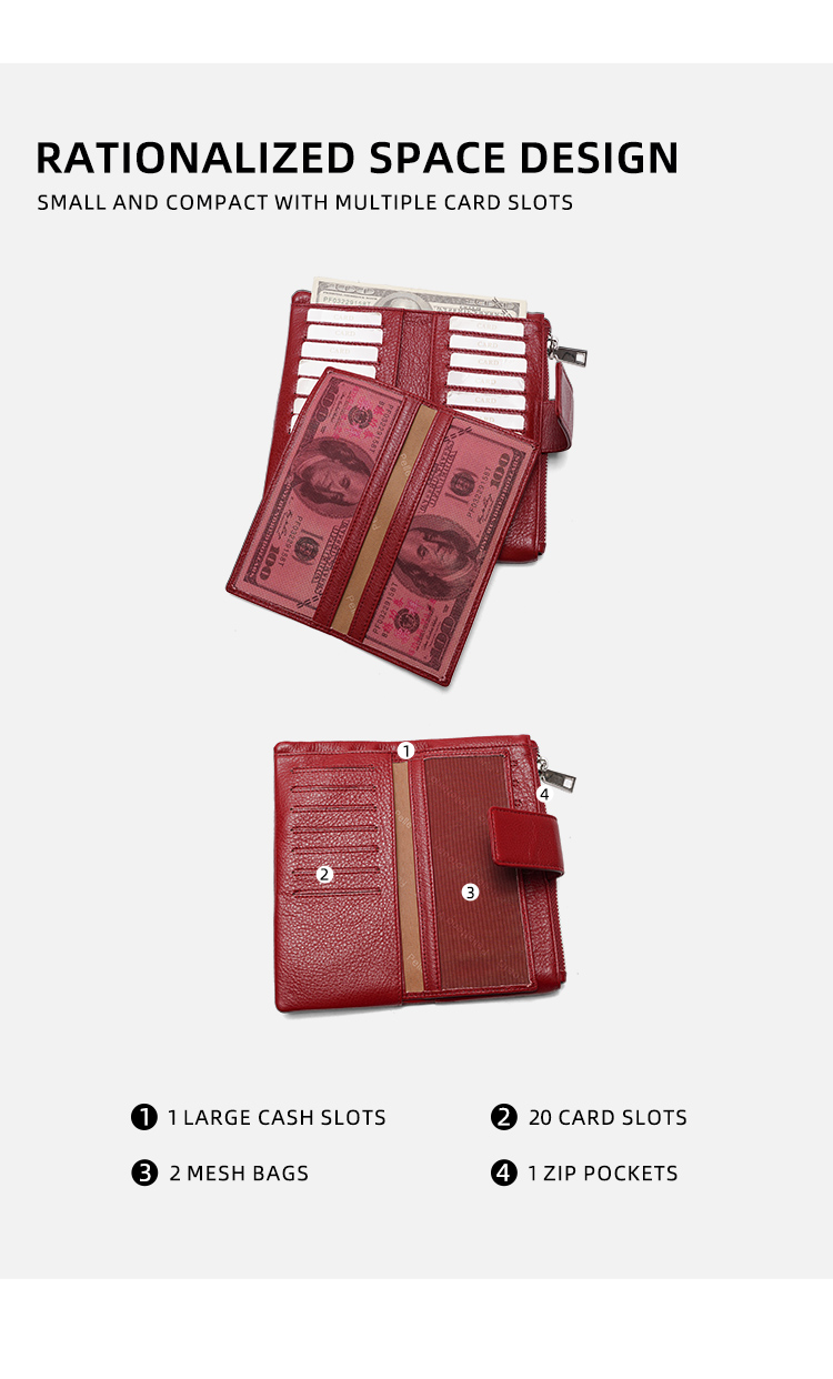 - 20 card slots to accommodate credit cards, IDs, memberships, and more