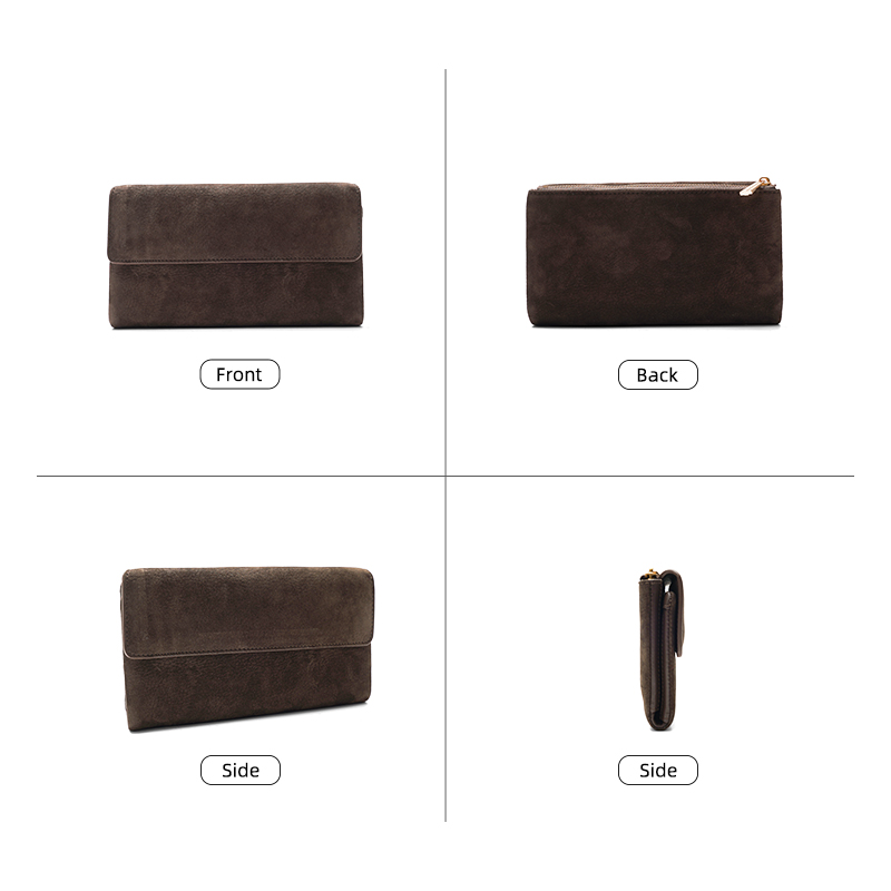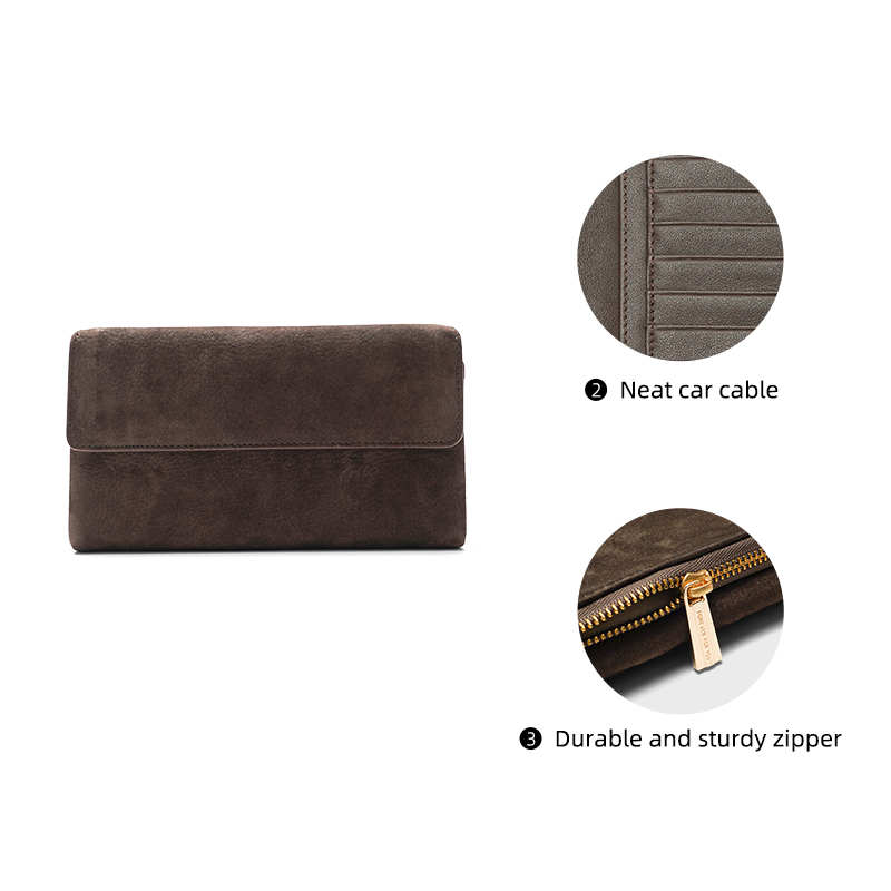 Crafted with a velvety suede exterior and smooth leather interior, this longline wallet combines sophisticated texture with exceptional storage capacity. Designed for those who carry multiple cards and cash, it balances generous space with a slim, elegant profile that fits seamlessly in purses or handbags.