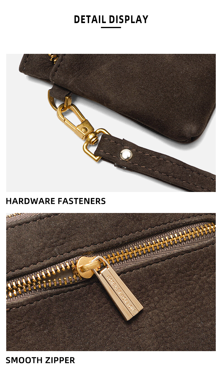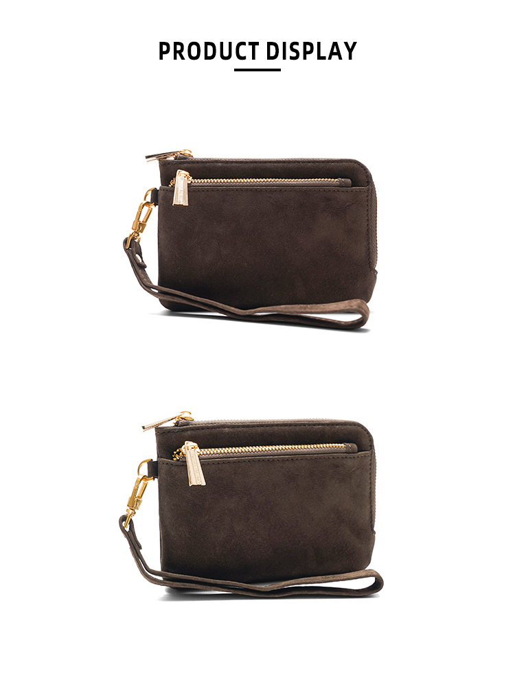 Crafted from luxuriously soft suede, this compact wristlet pouch blends minimalist design with practical organization, making it the perfect companion for quick errands, nights out, or travel. The rich, warm brown hue and polished gold hardware add a touch of understated elegance to your everyday carry.